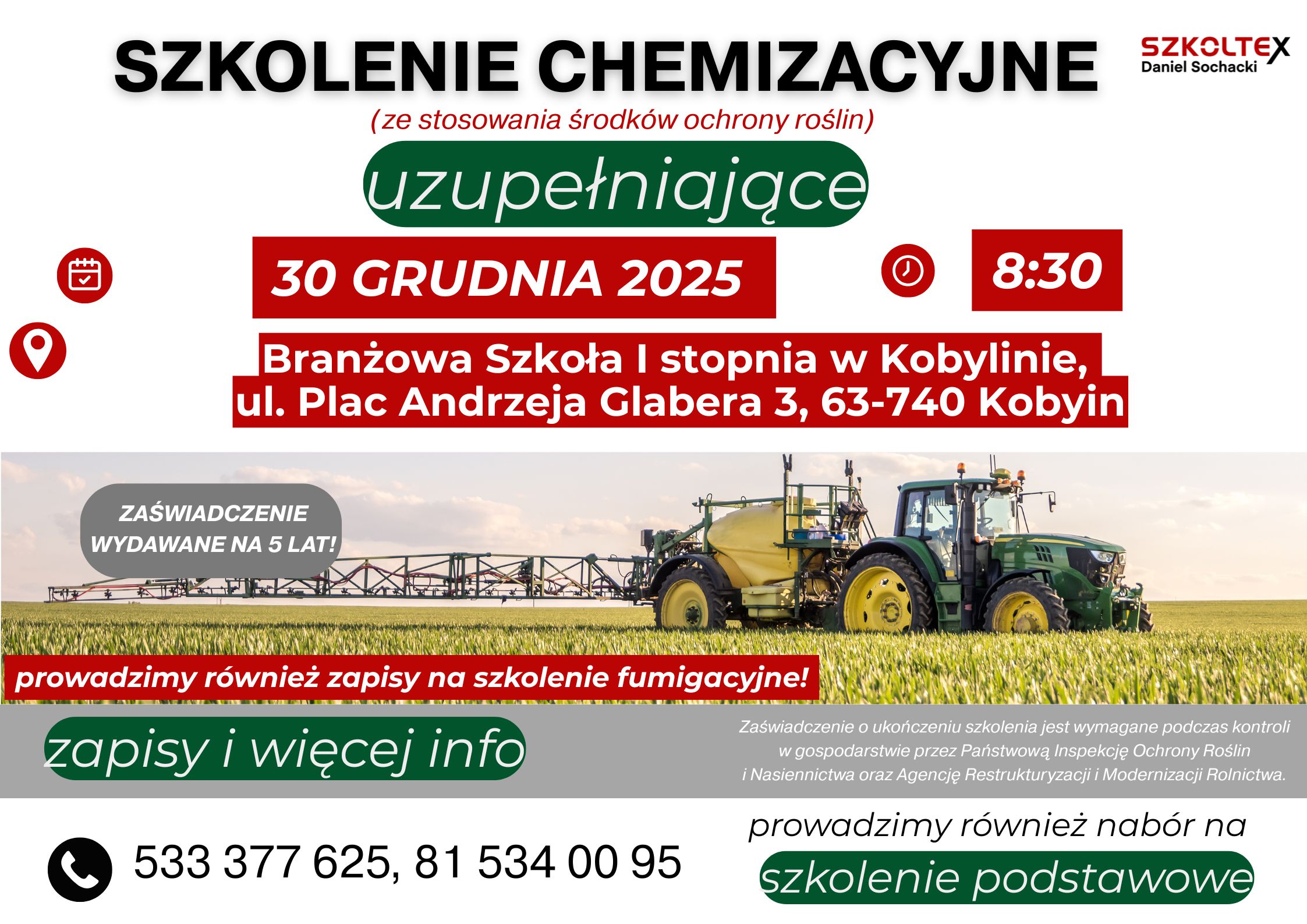 Urząd informuje, że na terenie Gminy odbędzie się obowiązkowe szkolenie w zakresie stosowania środków ochrony roślin (tzw. szkolenie chemizacyjne), organizowane przez firmę SZKOLTEX Daniel Sochacki z Lublina.